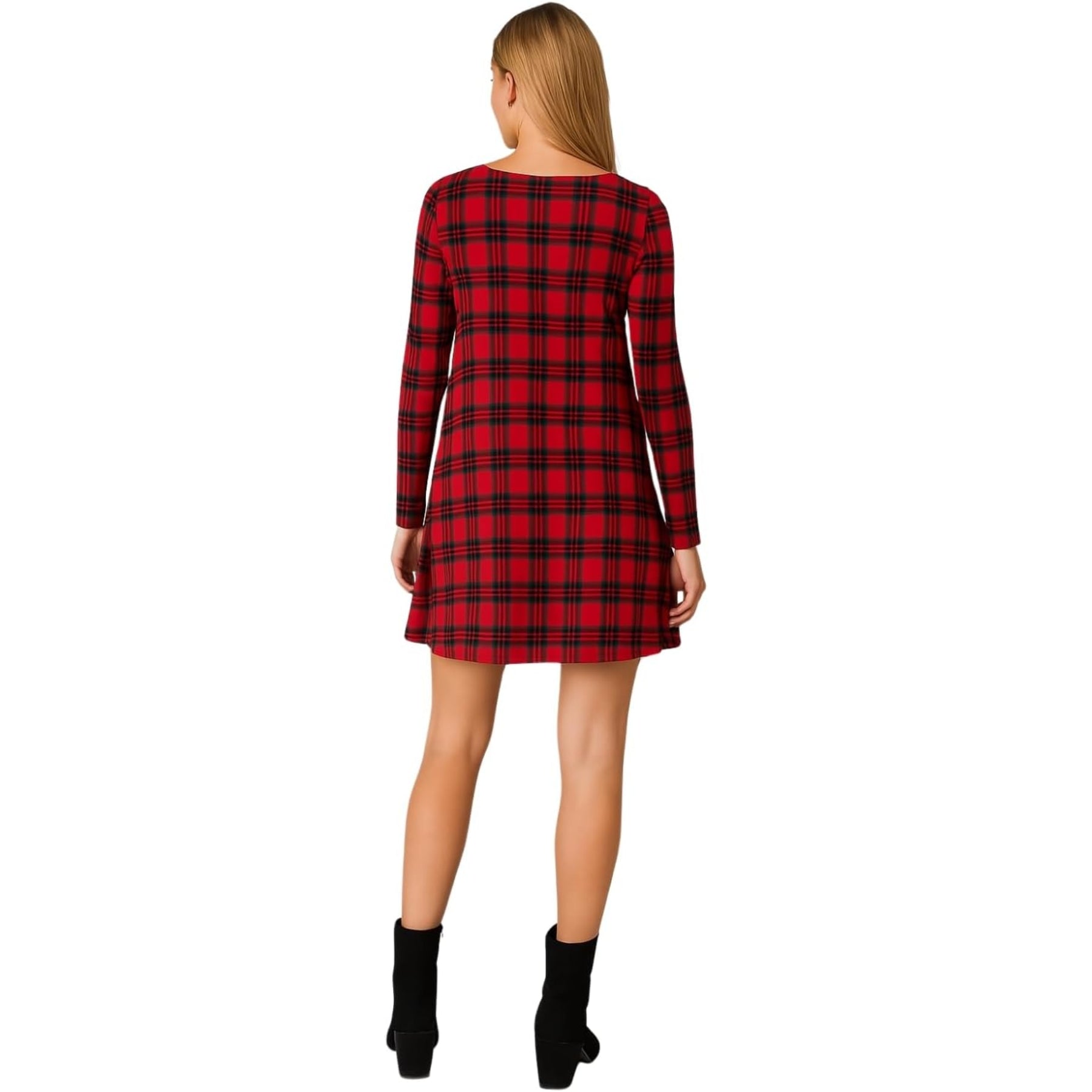 Printed Swing Skater Dress for Women Long Sleeve Tartan Check Mini Flared Dress Round Neck Plus Size Casual A-Line Tunic Dresses Red Tartan Print SM